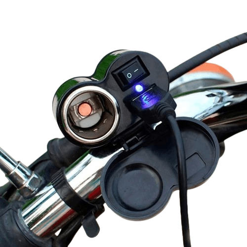 - Cargador renovado para tu moto, con encendedor incluido para cigarrillos.- Conector USB 2.1 y un interruptor independiente para administrar el consumo de energía.Características del producto:- Conexión 12V + 1 USB 5V 2.1- Encendedor cigarrillos- Modelo universal para guías de motos- Incluye agarre para la circunferencia del manubrio- Tamaño del producto: 3.5 cm de altura x 4.5 cm de profundidad x 6 cm de ancho- Longitud del cable: 120 cm- Color: Negro- Material de construcción: PVC (Pesa menos de 160gr)Hay un enchufe para encendedor de cigarrillos y puedes usarlo para proporcionar energía al dispositivo de navegación u otro dispositivo útil.Diseñado con un puerto USB, puede proporcionar una corriente estable para cargar el teléfono, el diseño del interruptor de control de energía puede controlar fácilmente la alimentación USB.La instalación es fácil y rápida, siendo el cable rojo para el positivo y el negro para el negativo.