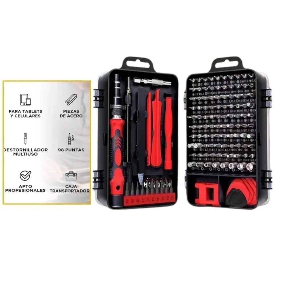 COLOR SUJETO A DISPONIBILIDAD.Kit Herramientas Precision 115 En 1 Celulares Pro' es un set de precisión diseñado de manera profesional y práctica. Su aspecto es hermoso y es fácil de llevar. Los mangos están diseñados de acuerdo con la forma de la mano de la mecánica del cuerpo humano y agregan una tapa trasera en espiral para que la operación sea más cómoda y ahorre mano de obra. Los lotes de trajes están diversificados, adecuados para el desmontaje de varios artículos, confiables y duraderos.Especificaciones:• Material: Destornillador de mango de plástico• Tamaño: Abrazadera: 122 mm / 4.8 ", agarre: 98 mm / 3.86", lote: 26-28 mm / 1.02-1.1 "(imagen de referencia de tamaño específico)Detalles del juego de destornilladores 115-IN-1:• 17 accesorios de desmontaje• 1 x mango• 1 x eje de extensión flexible• 1 x barra de extensión• 1 x pinzas• 3 herramientas de palanca de plástico• 1 x extracción de tarjeta SIM para• 1 x magnetizador / desmagnetizador• 1 x ventosa• 6 x púas de apertura• 1 x Portabrocas para destornillador eléctrico• 98 puntas de destornillador• Phillips: 2 PH0000 2 PH000 2 PH00 2 PH0 2 PH1 2 PH2• Ranurado: SL1.0 SL1.3 SL1.5 2 SL2.0 2 SL2. 5 SL3.0 SL3.5 SL4.0• Trox: T1 2 T2 2 T3 2 T4 2 T5 T6 T7 T8 T9 T10 T15 T20• Pentagonal: 2 P2 0.8 2 P5 1.2 P6 1.5 P8 2.0• Hex: H0.7 H0.9 H1.3 H1.5 H2.0 H2.5 H3.0 H3.5 H4.0 H4.5 H5 H6• POZI: PZ000 PZ00 PZ0 PZ1 PZ2• Tri-punto: 2 Y0.6 Y2.0 Y2.5 Y3.0• Triángulo: 2.0 2.3 2.6 3.0• Forma de “U”: 2 U2.6 2 * U3.0 U8• Cuadrado: S0 S1 S2• MEDIO: W2.0 W2.0• SIM: 0.8 1.0• 4MM Zócalo: M2.5 M3.0 M3.5 M4.0 M4.5 M5.0 M5.5• ICS: PH2