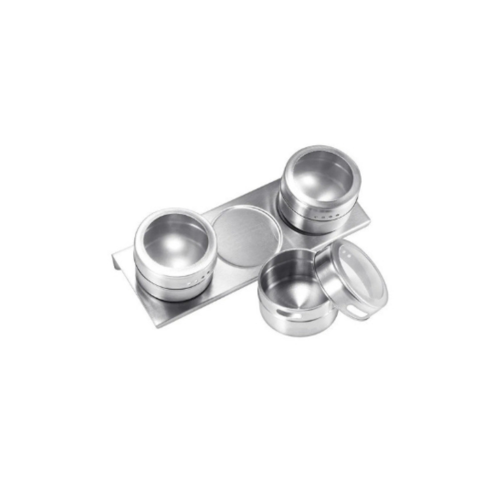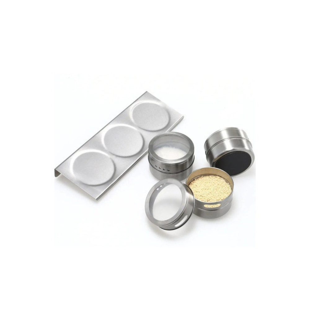 Set de 3 Especieros Imantados.Organizá tus condimentos de forma práctica y elegante con este set de 3 especieros de acero inoxidable. Cada recipiente cuenta con tapa transparente para ver fácilmente su contenido y saber cuándo recargar.✅ Diseño imantado: tanto los frascos como la base son magnéticos, ideales para mantener todo en su lugar sin esfuerzo.✅ Tapa giratoria con doble opción de vertido: controlá la cantidad que usás.✅ Medidas: 6 cm de diámetro x 4 cm de alto.Perfectos para cocina moderna, gourmet o regalar. Compactos, funcionales y con mucho estilo.