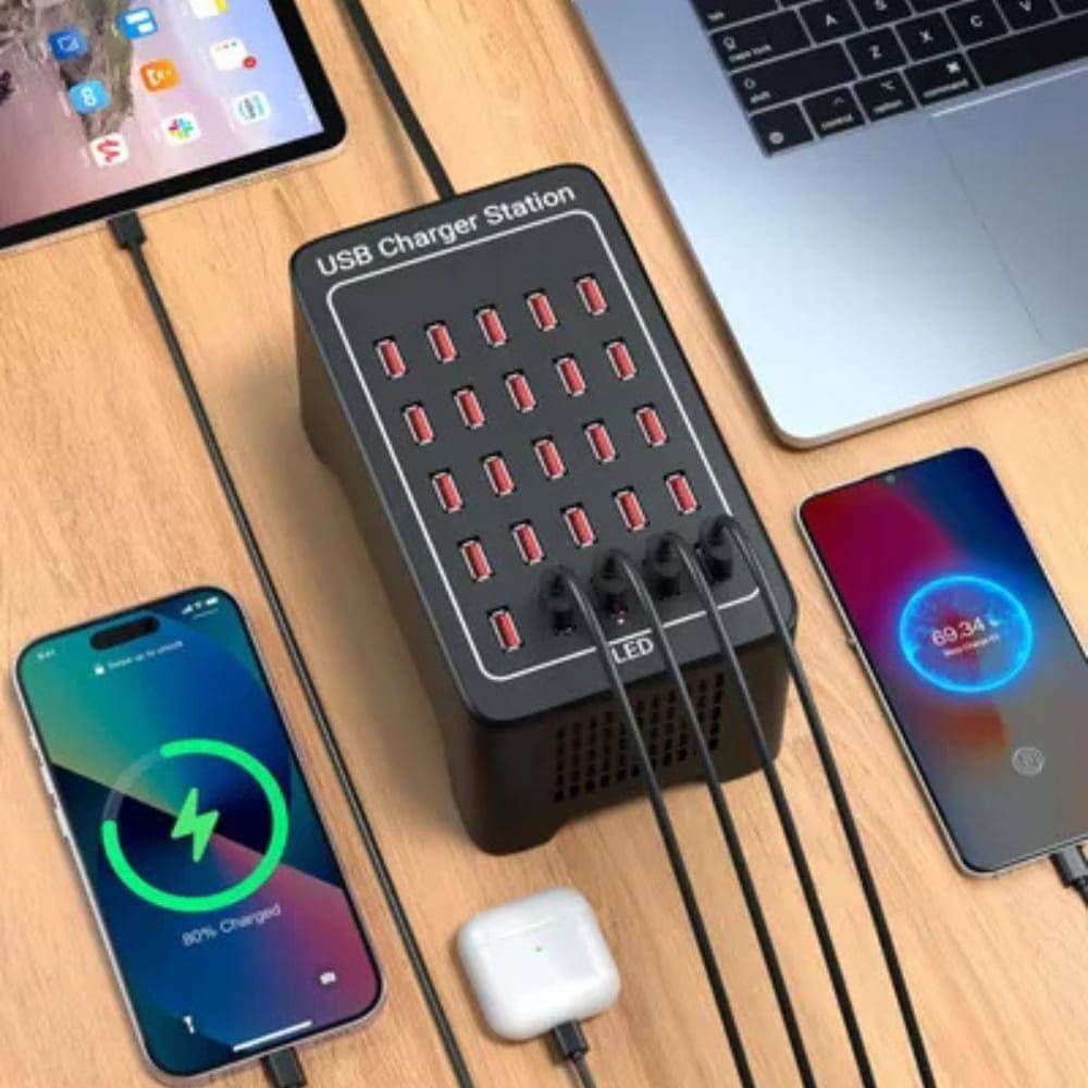 La Estación de Carga Multipuerto USB es la solución ideal para aquellos que necesitan cargar múltiples dispositivos de manera rápida y eficiente al mismo tiempo. Con una capacidad de hasta 20 puertos, esta estación de carga está diseñada para atender las demandas de escuelas, oficinas, hogares y otros entornos de trabajo o esparcimiento que requieren cargar varios dispositivos simultáneamente. Su capacidad de carga rápida permite conectar hasta 20 dispositivos al mismo tiempo, como teléfonos móviles, tabletas, auriculares, Kindle y otros gadgets, lo que la convierte en una herramienta indispensable para espacios donde la conectividad es esencial.Especificaciones Técnicas:- Tipo de Producto: Estación de Carga con 20 puertos USB (100W)- Tamaño: 148x78x58 mm- Entrada: 100-240V, 50-60Hz- Salida: 5V / 20A (100W)- Protección de Sobrecarga de Salida: 90% - 105%- Material: PC ignífugo- Incluye: 1 Estación de Carga USB, 1 Cable de Alimentación (enchufe tipo UU), 1 Manual de Usuario.