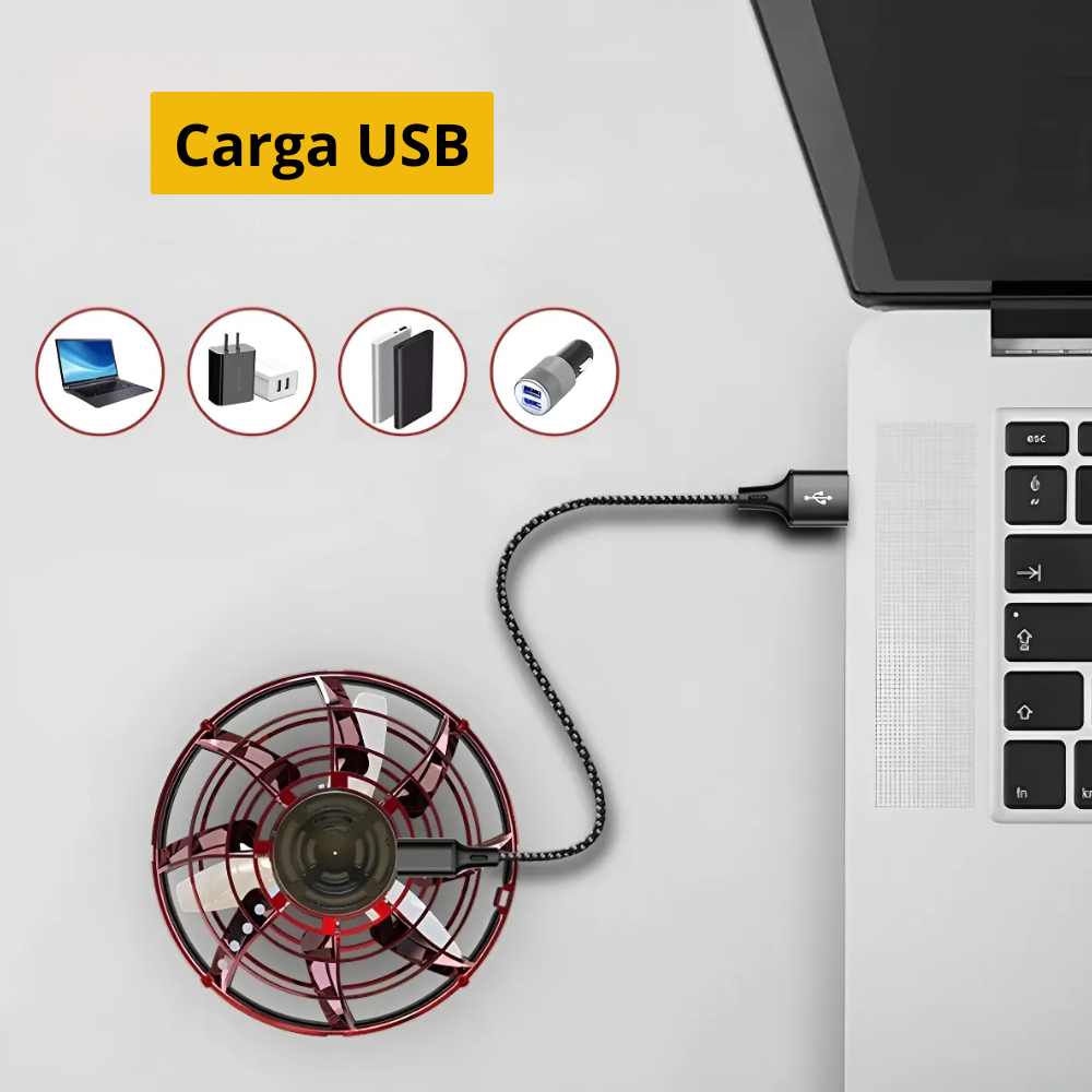 Spinner Con Luz Led Volador Trompo Luminoso Diversión NiñosPuedes tirarlo y atraparlo tú mismo. Viajará de forma estable en línea recta si lo lanzas hacia abajo. Todo lo que necesitas hacer es girarlo y darle un lanzamiento. Diferentes velocidades y ángulos de lanzamiento permiten diferentes caminos de vuelo, trucos y maniobras de alta velocidad. Enciende el botón de encendido, mantén el eje central y gira la rueda para comenzar.Ligero y flexible flexible para soportar innumerables golpes. Está diseñado para jugar tanto en interiores como en exteriores.Se puede cargar a través de cualquier puerto USB. Se tarda 15 minutos para una sola carga y 15 minutos en volar.El diseño de la carcasa tipo rueda puede amortiguar el impacto hasta mayor medida y es más seguro durante el uso.DATOS TECNICOSMaterial: Plástico.Capacidad de la batería: 100 mAh.Carga: Micro USB .Medidas: 8 cm x 8 cm x 4 cm.A partir de 14 años.