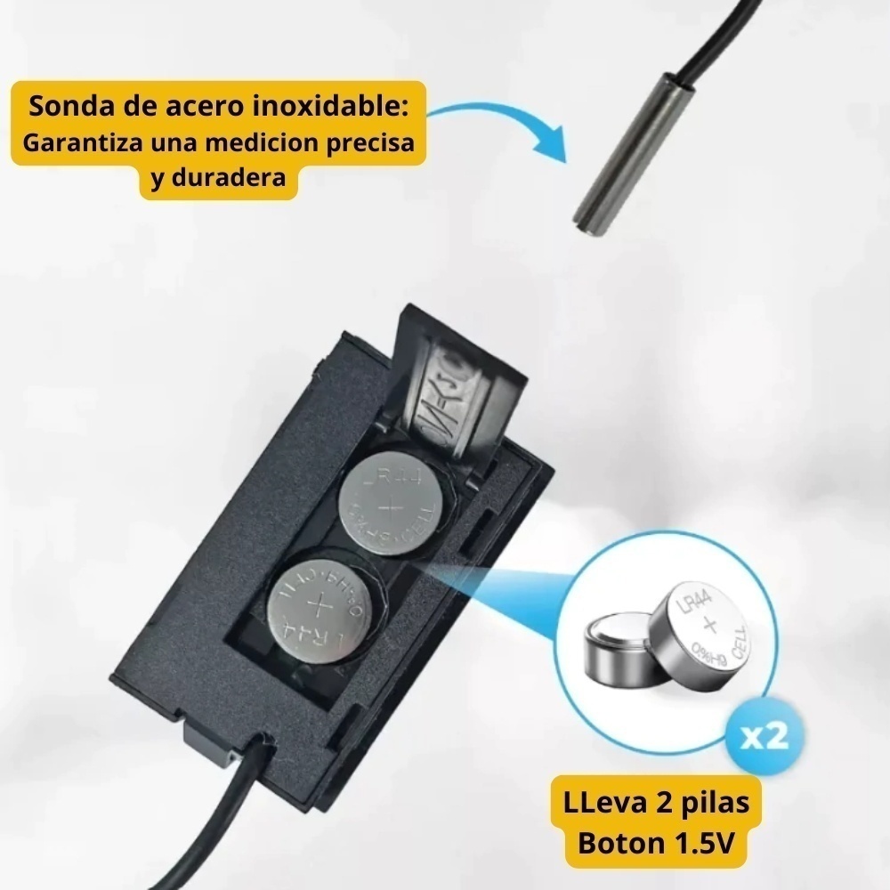 Medidor de temperatura con Sensor impermeable: equipado con una sonda resistente al agua de alta precisión, puede comprobar la temperatura de interiores y exteriores como habitaciones con aire acondicionado, frigoríficos, acuarios o incluso la temperatura del agua y la temperatura corporal.Pantalla grande: paneles LCD en línea, resistente a la humedad.Amplio rango de medición de temperatura de -50 °C hasta 70 °C.Mini tamaño: el termómetro digital de tamaño compacto y elegante con carcasa ultrafina, se puede poner en cualquier lugar. Herramienta de medicion ideal para interior, exterior, casa, laboratorio, biblioteca, etc.DATOS TECNICOS:- Medidas: 48 mm x 28.6 mm x 15.2 mm Aprox.- Longitud del cable: 100 cm.- Rango de medición: -50 °C hasta 70 °C.- Precisión: ± 1 ºc.- Alimentación: 1 LR44 pilas de botón (incluidas).